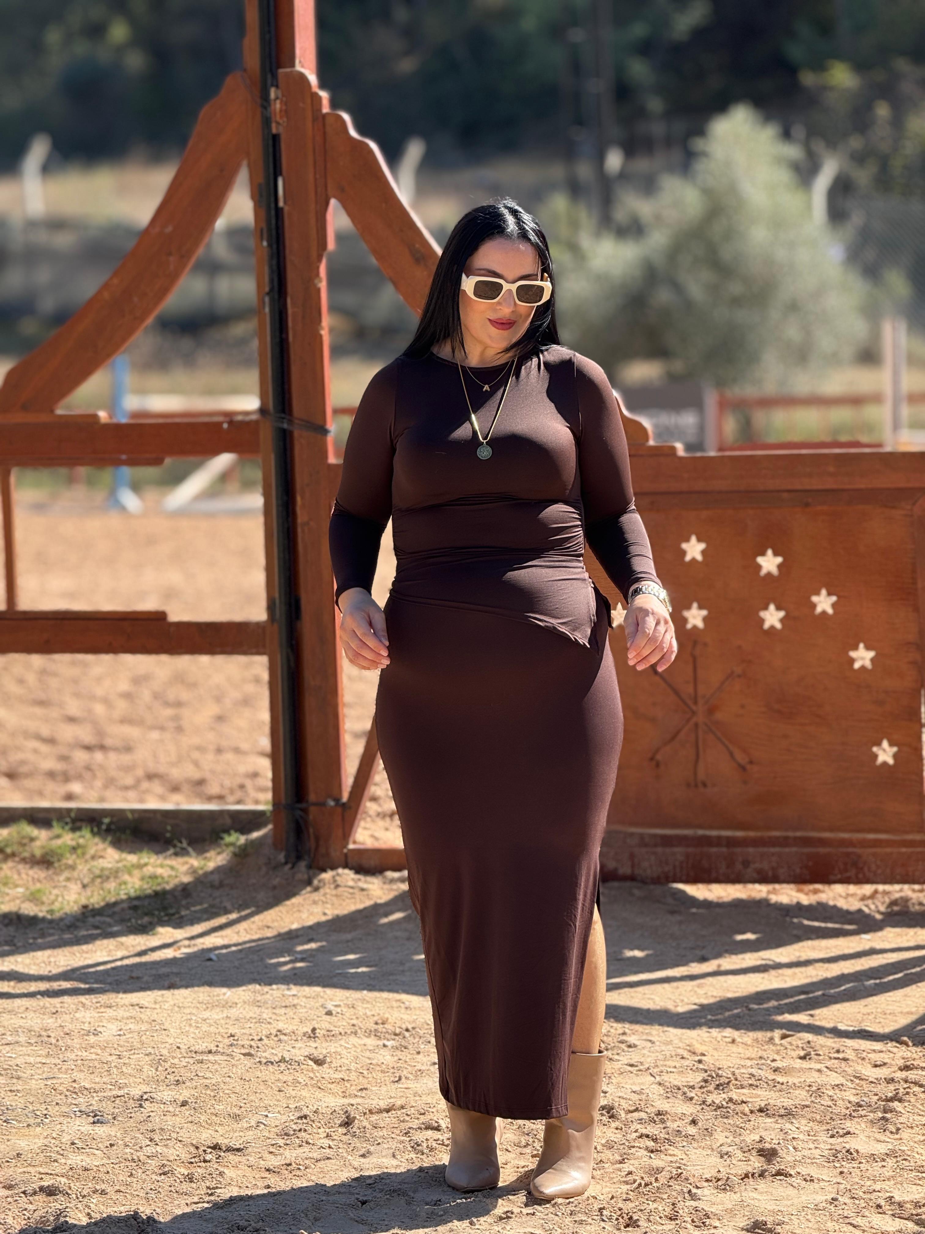 Işıltılı saten kumaşı, akıcı formu ve slim kesimiyle vücuda zarif bir duruş kazandırır. Kahverenginin derin tonu, hem sofistike hem de doğal bir ışıltı yaratırken; günün her saatinde şıklığı zahmetsizce tamamlar.