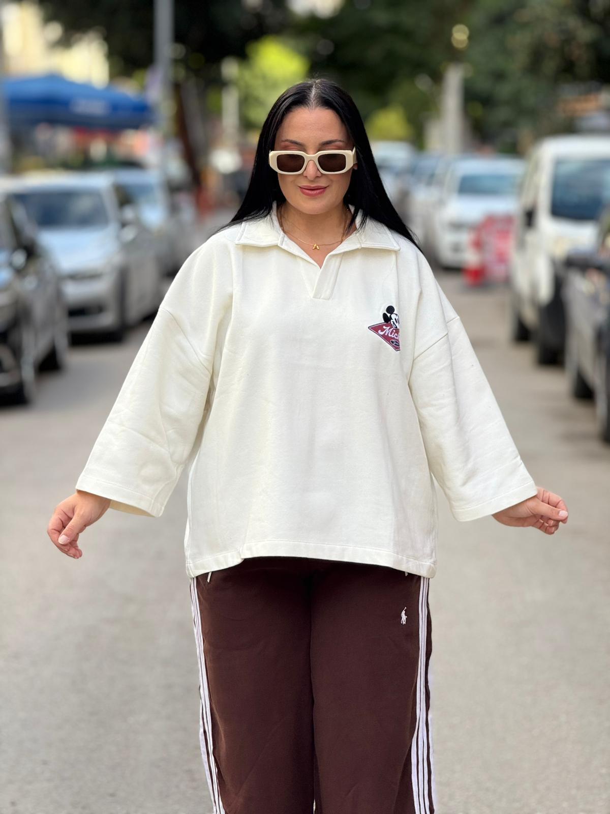 Yüksek pamuk oranlı kumaşıyla nefes alan yapıdadır; gün boyu konfor ve hareket özgürlüğü sunar. Üzerindeki Mickey baskı detayı, klasik beyaz sweatshirt’lere eğlenceli bir dokunuş kazandırır. Jean, tayt veya eşofman altlarıyla kolayca kombinlenebilir — ister şehirde ister evde, rahat ve stil sahibi bir görünüm sağlar.